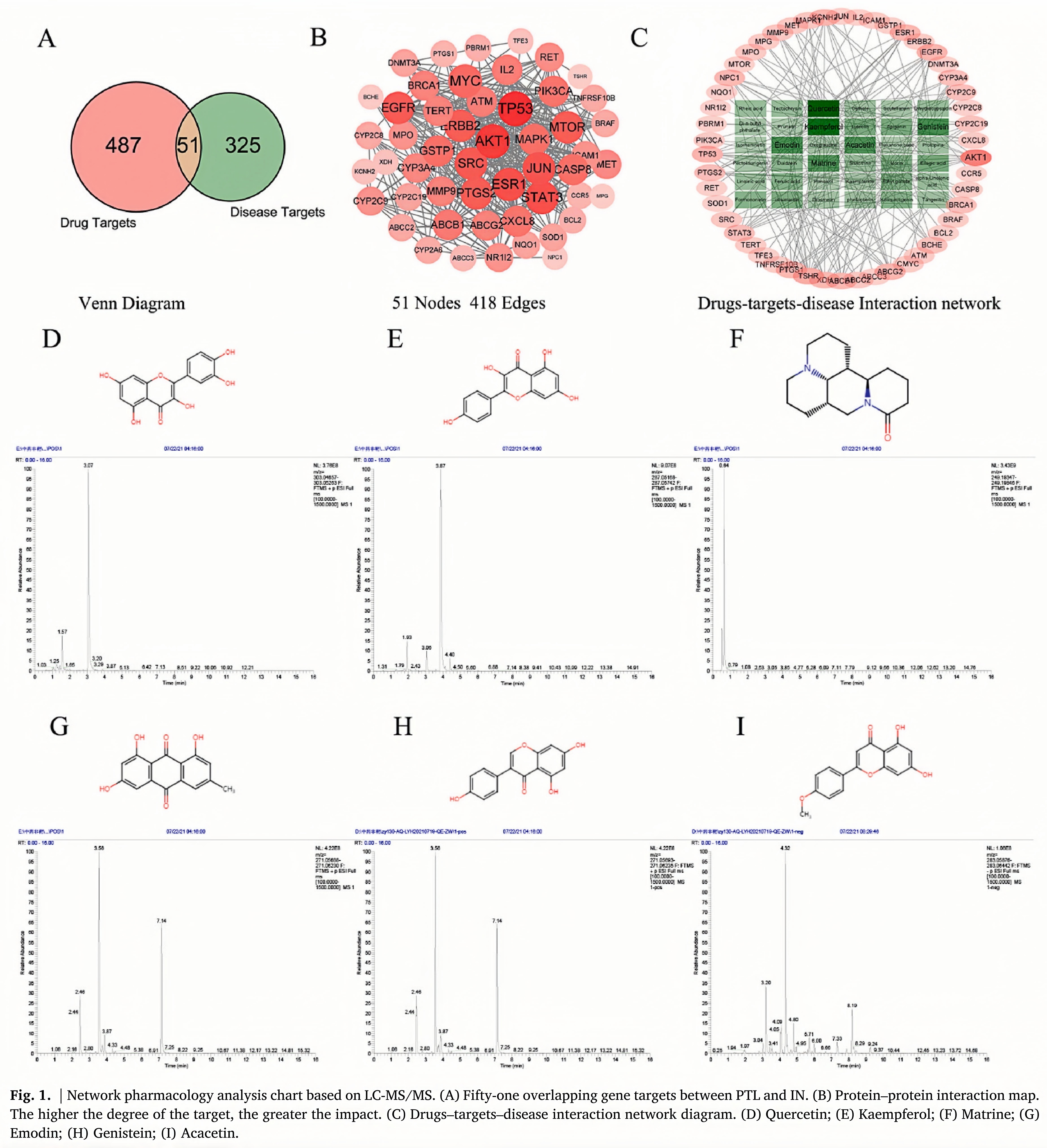 Based on the absorption, distribution, metabolism, and excretion (ADME) parameter standard, after removing duplicate targets, we retrieved 538 candidate targets from drug-related databases and ob- tained 376 candidate targets from five disease-related databases. A total of 51 PTL anti-IN potential targets were used to construct the PPI network. We imported the PPI network diagram into the Cytoscape software for visualization (Fig. 1A and B). The results show that the core targets included AKT1, TP53, MYC, STAT3, MAPK1, MTOR, EGFR, SRC, and JUN. Then, we used Cytoscape software to construct a network visualization of drugs-targets-disease interactions (Fig. 2C). Based on drugs-targets-disease interaction network analysis results and a literature search, we posited that the main anti-tumor active compounds in PTL were quercetin, kaempferol, matrine, emodin, Genistein, and Acacetin. (Fig. 1D-I). The ADME details of these compounds are in Table 3.