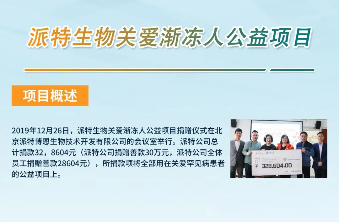 【派特生物關(guān)愛漸凍人公益項目一助力漸凍人舒暢呼吸】是由蒲公英漸凍人關(guān)愛中心攜手派特生物公司發(fā)起的公益項目,派特生物總資助金額149000元(拾肆萬九仟元整) 。