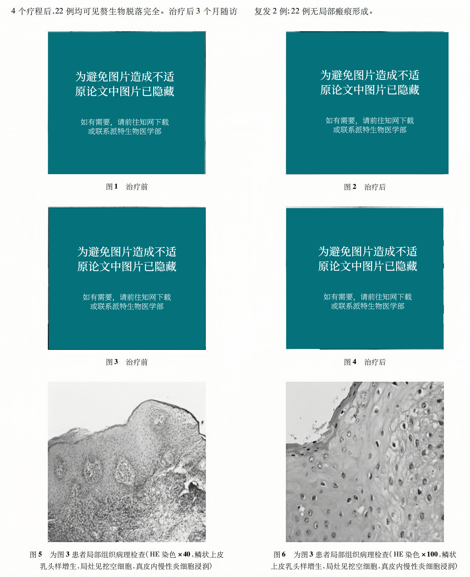 肉眼及醋酸白實驗觀察患者疣體消除,且在治療后3個月內(nèi),原疣體部位未復(fù)發(fā)。