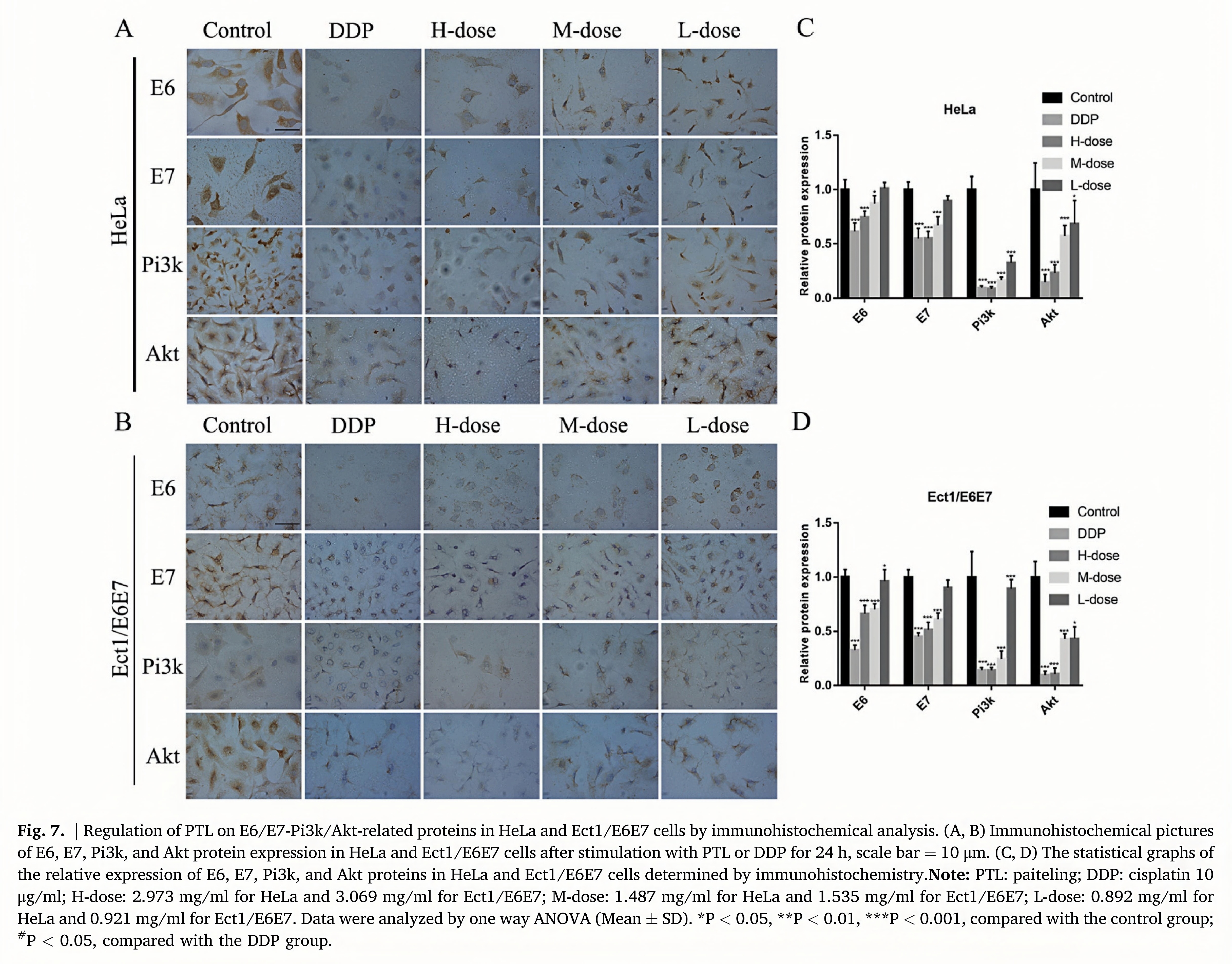 HeLa and Ect1/E6E7 cells were planted on glass coverslips at a density of 3 × 104 cells/well and were incubated in an incubator at 37°C with 5% CO2. Cells were then starved for 24 h with serum-free DMEM to keep cells in the same growth cycle, After that we added PTL diluent to stimulate cells for 24 h. Next, the cells were fixed with 10% formalde- hyde dissolved in PBS for another 20 min. The cells were permeabilized with PBS containing 0.5% TritonX-100 for 10 min, and antigen retrieval solution (Solarbio) was applied for 10 min; then, 10% goat serum was added dropwise, and the cells were kept at 37 ?C for 1 h. After antibodies were added dropwise, the glass coverslip was placed in a refrigerator at 4°C and incubated for 12 h. The antibodies we used included E6 (1:50), E7 (1:50), Pi3k (1:25), and Akt (1:50). The next day, secondary anti- bodies (1:1000) were added to glass coverslips and incubated for 30 min. The cell samples on the glass coverslips were stained with hema- toxylin for 10 s, and the cells were washed with PBS three times, dehydrated with gradient ethanol, treated with xylene for 15 min, and then fixed with neutral gum. Finally, they were observed with an optical microscope at magnification of 400 times. ImageJ software (National Institutes of Health, USA) was used to compare the relative expression of the positive staining areas of E6, E7, Pi3k, and Akt.