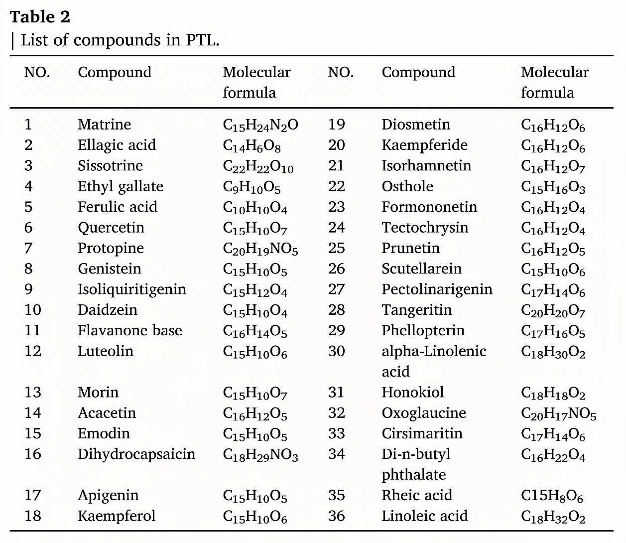 We used LC-MS/MS method to determine the chemical components in PTL, and combined with literature analysis, 36 active chemical components of PTL were identified. Among them, there were 19 flavo- noid components, 4 alkaloid components, 2 phenolic components, 2 fatty acne components, 2 anthraquinone components, and 7 other types of components(Table 2). Among these compounds, flavonoids accoun- ted for the highest proportion, 52.8%, and alkaloids accounted for 11.1%.