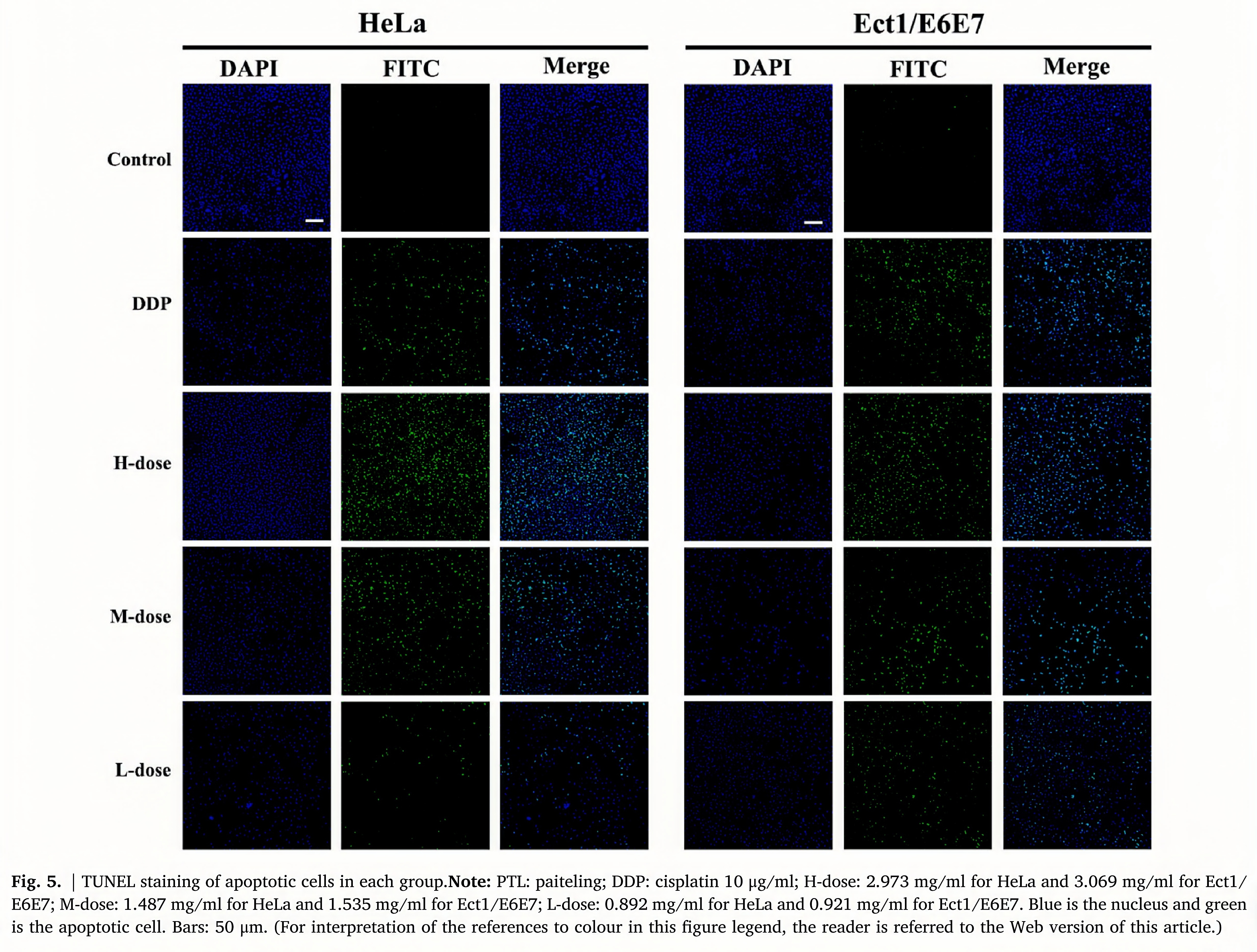 The results of TUNEL staining showed that Hela and Ect1/E6E7 in the control group had almost no apoptosis. Compared with the control group, the apoptotic tumor cells increased in the DDP group and PTL (H-, M-, or L-dose) group. And compared with the PTL L-dose group, then umber of apoptotic cells increased in the PTL H-dose group (Fig. 5).