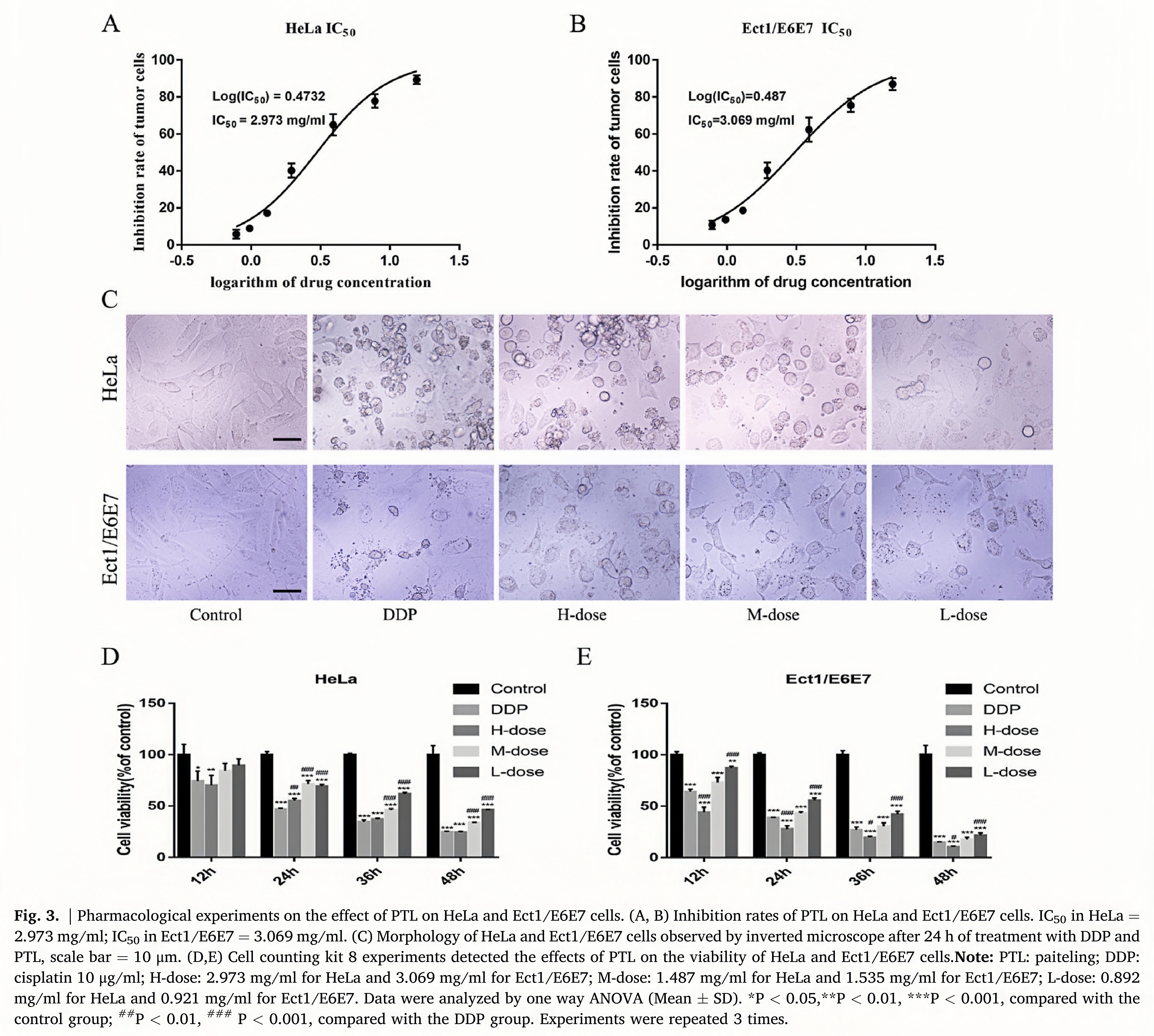 We selected well-grown HeLa and Ect1/E6E7 cells in the logarithmic growth phase for experiments and seeded them in 96-well plates at 5000 cells per well (100 μl). According to the results of the preliminary experiment, the PTL stock solution was diluted to seven different con- centrations (i.e., 1/64, 1/128, 1/256, 1/512, 1/768, 1/1024, and 1/ 1280), and the corresponding drug mass concentrations were 15.625, 7.813, 3.906, 1.953, 1.302, 0.977, and 0.781 mg/ml, respectively. After 24 h of PTL stimulation, We added medium containing a final concen- tration of 0.5 mg/ml MTT (Beijing BioDee Biotechnology Co., Ltd.) toeach well and continued to culture for 3 h. Then we removed the old medium, added 200 μl of dimethylsulfoxide and shook it on a constant temperature shaker at 37°C for 10 min. Finally, we used an automatic microplate reader to detect the A value at 490 nm we took the average value of OD to calculate the growth-inhibition rate. After the PTL con- centration of each group was processed logarithmically, a scatter dia- gram was made to calculate the IC50 value of the PTL. In the follow-up test group, we designated IC50 as the highdose group, 50% of IC50 as the medium-dose group, and 33% of IC50 as the low-dose group.
