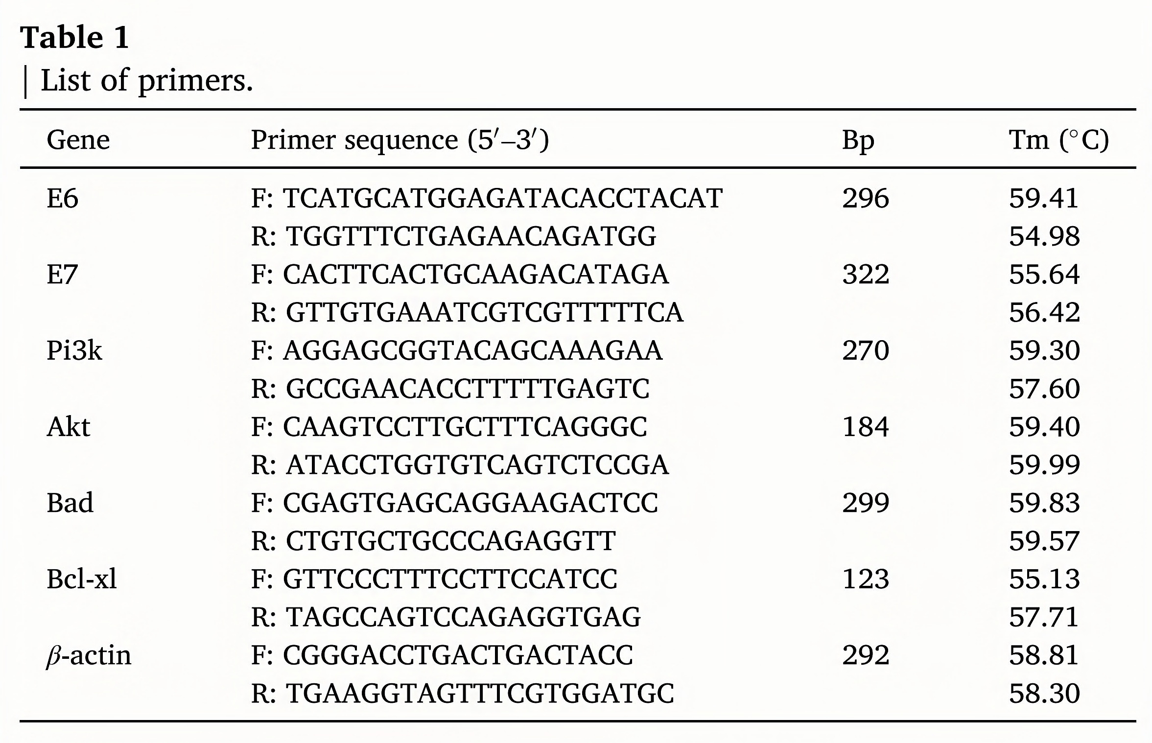 In order to further verify the molecular mechanism of PTL-induced apoptosis of HeLa and Ect1/E6E7 cells, we used PCR experiments to evaluate the relative expression of E6, E7, Pi3k, Akt, Bad, and Bcl-xl mRNAs). We found that after 24 h of PTL stimulation, the relative mRNA levels of E6, E7, Pi3k, Akt, and Bcl-xl in HeLa and Ect1/E6E7 cells were significantly downregulated. On the contrary, the relative mRNA expression levels of the apoptotic gene Bad decreased. The same result was also observed in the DDP group (Fig. 6).