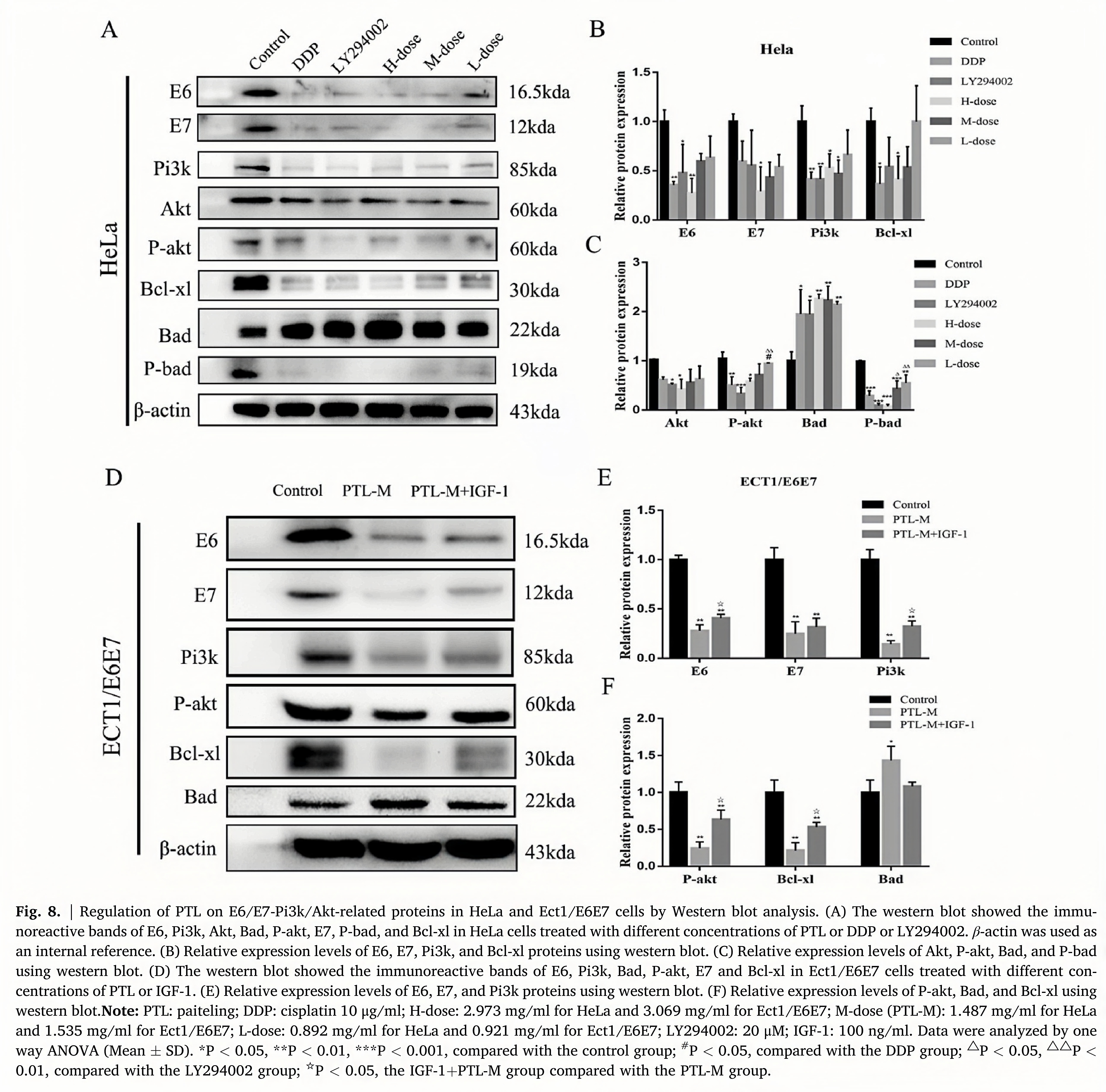 In addition, We used cellular immunohistochemistry (Fig. 7) and the western blot (Fig. 8) to detect the expression of E6, Pi3k, Akt, E7, P-akt, P-bad, Bad, and Bcl-xl proteins in tumor cells infected with HPV. We found that after 24 h of stimulation with PTL H-dose, the expression of E6, E7, Pi3k, Akt, P-akt, Bcl-xl, and P-bad proteins in tumor cells were significantly lower than those of the control group, while the expression of Bad increased significantly. The results of the PTL H-dose group are similar to those of the LY294002 group and the DDP group. In addition,the expressions of Pi3k, P-akt, E6, E7, and Bcl-xl proteins were significantly decreased in the middle-dose PTL group, but increased after the addition of the Pi3k/Akt activator IGF-1. The expression of Bad protein was significantly increased in the middle-dose group of PTL, but decreased after the addition of the akt activator IGF-1.