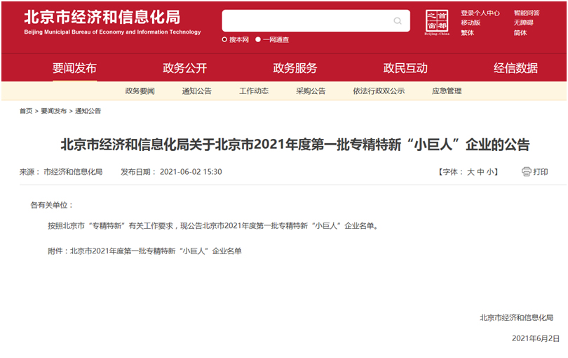2021年6月2日北京市經(jīng)濟(jì)和信息化局發(fā)布關(guān)于北京市2021年度第一批專精特新“小巨人”企業(yè)的公告,北京市共285家企業(yè)入選。我公司以高質(zhì)量的創(chuàng)新產(chǎn)品和獨(dú)特領(lǐng)先的產(chǎn)業(yè)技術(shù)和市場(chǎng)優(yōu)勢(shì),經(jīng)過(guò)審核公示最終入選。